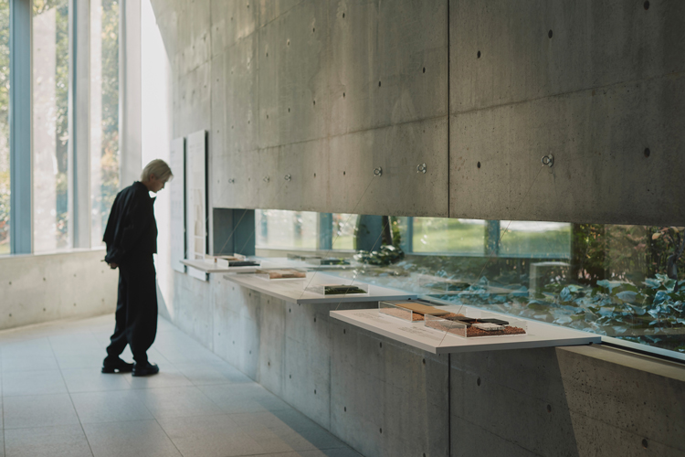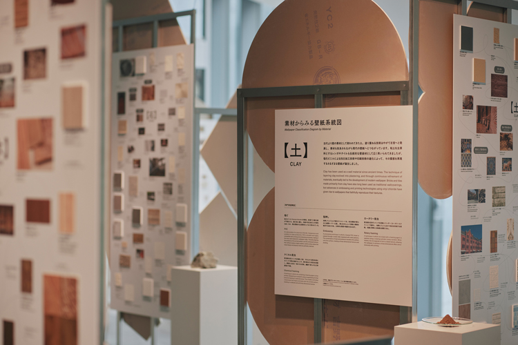 展示の中心は、私たちの生活の中でよく目にする壁紙が、どのようなインスピレーションから現在の塩ビシートを中心とした商品の模様や形状に至ったのか、「織」「石」「土」「木」「紙」の5種を基点に、素材ごとの系統図を紐解くインスタレーションです。続いて、自然のサイクルに寄り添いながら、「これからの壁装材のあり方」について探求した素材とその実践例を紹介します。そして一番奥は、1960年にサンゲツが初めて発行して以降、高度経済成長期を経て発展した壁紙見本帳の世界を堪能できるコーナーです。160冊超のサンゲツのアーカイブを系譜にまとめたハンドアウトを配布しているほか、貴重なページの数々が展示されています。各時代の代表的な見本帳の実物をめくりながら閲覧することもできます。ぜひ、各時代のインテリアの世界に思いを馳せながら、手に取って「選ぶ楽しさ」を感じてみてください。