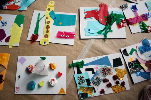 今回のワークショップでは、まず、子どもたちにカチナとは何かを知ってもらい、子どもたち一人ひとりにとってのカチナを、目をつむって、耳をすまして、想像してもらうことから始めました。それをさまざまな用紙をコラージュして自由に表現してもらいます。