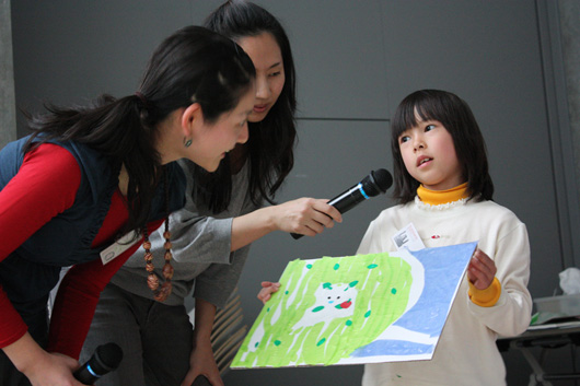 ソットサスの描いたカチナの前で。大人同様、子どもにとっても自分の気持ちや思いを表現することはとっても大切。表現の仕方は、遊びでも、運動でも、音楽でも、お友達とのおしゃべりでも何でもOK。でも、時には、自分の心と向き合って、試行錯誤しながら、じっくり何かを作り込んでいくという時間を過ごすことで思わぬ発見があるかもしれません。今回のワークショップでも、佐藤文香さんやお父さんお母さんが見守る中で、子どもたちが魅力的な作品をたくさん作ってくれました。このワークショップに参加してくれた子どもたちのなかから、将来、ソットサスや倉俣さんに負けない、素敵なアーティストやデザイナーが生まれてくれれば...と願わずにはいられません。