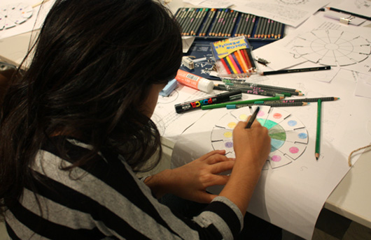最後に挑戦したのは「フェナキスティスコープ」。厚紙、割り箸、画鋲でできたこのビジュアル・トイは、絵の描かれた紙にいくつもの穴がならんでいて、鏡の前でその紙を回しながら一点をのぞくことによって、絵が動くことを体験できるものです。前半の2種類に比べ、より複雑な仕組みでアニメーションを体験できるトイに、こどもたちも興味津々。その後すぐに絵を描きはじめる参加者たちも多く、3つめの創作に慣れてきたのか、それぞれの自由な発想を持って取り組んでいました。