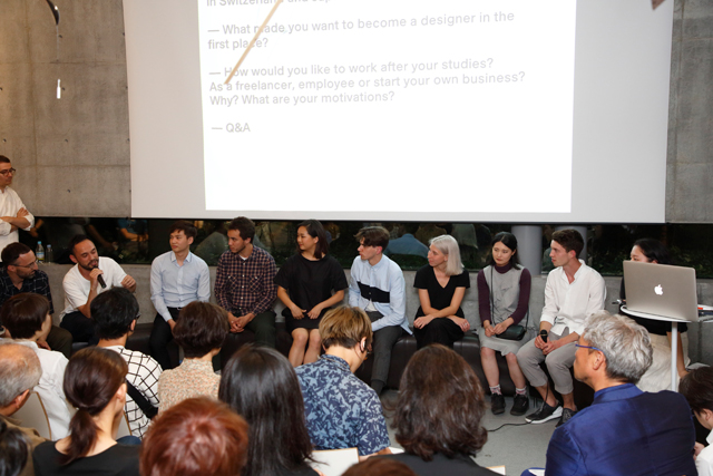 続いて、ゲストスピーカーの熊野 亘とダヴィッド・グレットリが登壇し、まずは自身の仕事を紹介しました。その後、ECALより3名、多摩美術大学より4名の学生達とともにディスカッションを行いました。学生達もスイスと日本、それぞれの文化や教育、デザインについて、活発に意見を交わしました。