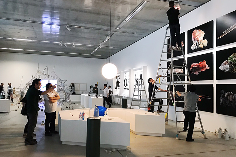 7月中旬、虫展は設営の真っ只中だった。展示台が次々と会場に運び込まれ、出展作家が会場内で作品の設置をしている。700倍に拡大された「ゾウムシの脚」が現れて、隈 研吾さんと3名の構造設計家による3つの「トビケラの巣」もだんだんと組み上げられ、小檜山賢二さんの写真も掲げられ、会場は少しずつ展覧会らしくなる。山中俊治さんの昆虫のロボットはなかなか思うように動かないらしく、現場での調整が続いていた。帰国後に岡さんが編集を進めていたラオスの映像も、ついに投影された。展示後半の廊下のなかで、小林さんが蛾と一緒に踊り続けている。全部の作品については書ききれないけれど、作家も企画チームのメンバーも、朝から晩まで現場で作業を続けていた。卓さんも連日会場を歩き回って、細かい部分を企画チームや作家の方々と話し合っていた。