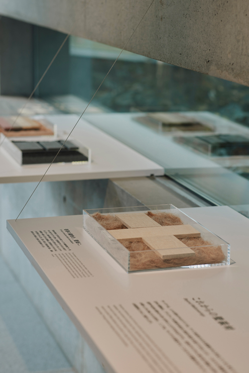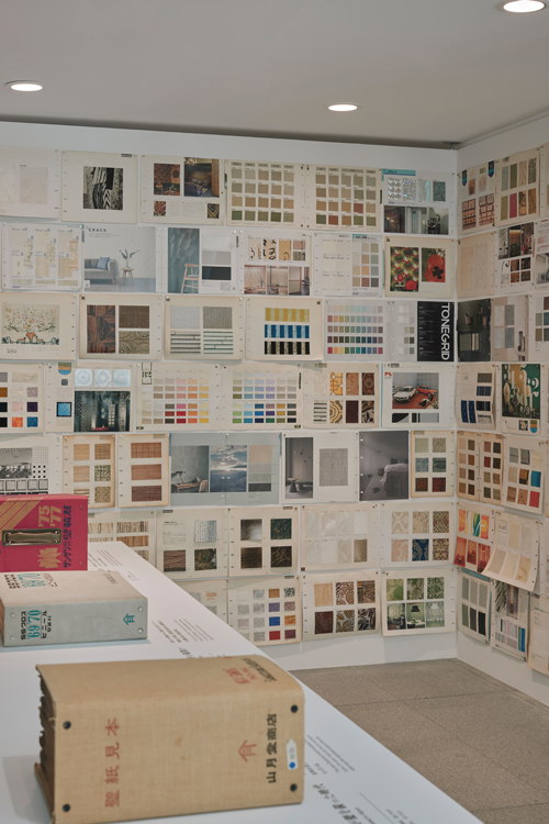 展示の中心は、私たちの生活の中でよく目にする壁紙が、どのようなインスピレーションから現在の塩ビシートを中心とした商品の模様や形状に至ったのか、「織」「石」「土」「木」「紙」の5種を基点に、素材ごとの系統図を紐解くインスタレーションです。続いて、自然のサイクルに寄り添いながら、「これからの壁装材のあり方」について探求した素材とその実践例を紹介します。そして一番奥は、1960年にサンゲツが初めて発行して以降、高度経済成長期を経て発展した壁紙見本帳の世界を堪能できるコーナーです。160冊超のサンゲツのアーカイブを系譜にまとめたハンドアウトを配布しているほか、貴重なページの数々が展示されています。各時代の代表的な見本帳の実物をめくりながら閲覧することもできます。ぜひ、各時代のインテリアの世界に思いを馳せながら、手に取って「選ぶ楽しさ」を感じてみてください。